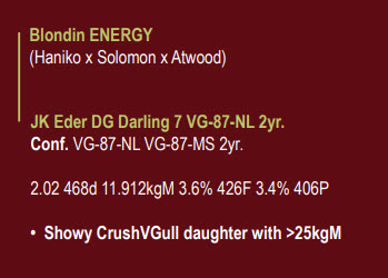 She produces in her first lactation >11.900kgM with 3.4% Protein