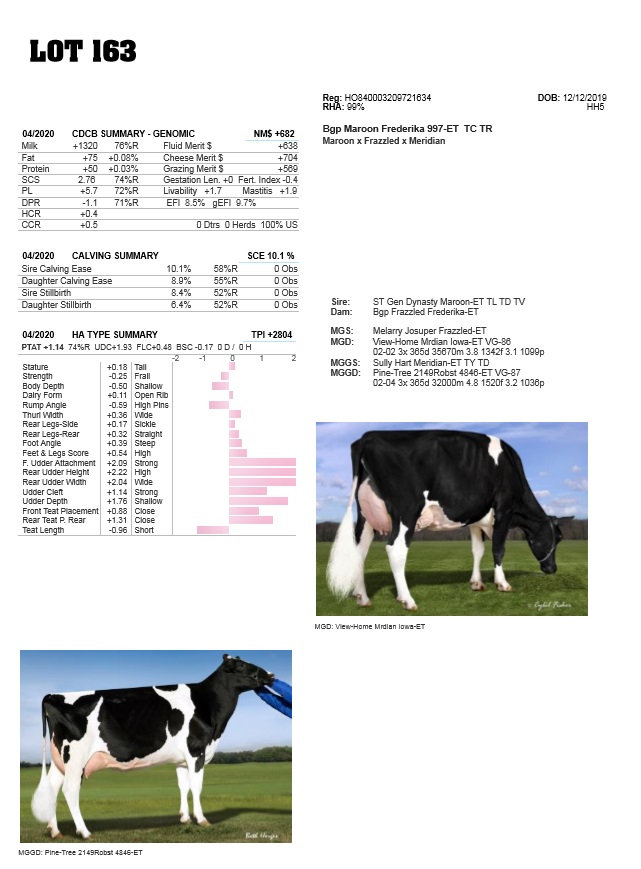 OFFICIAL ID: HO840003209721634 SIRE: Maroon DAM: Frederika TPI: 2804 DWP: NM$: 682 CM$: 704 DWP: 638 MILK: 1320 FAT: 75 PROTEIN: 50