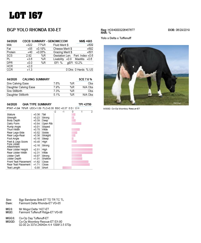 OFFICIAL ID: HO840003206457677 SIRE: Yolo DAM: Rhonda TPI: 2799 DWP: 734 NM$: 665 CM$: 692 DWP: 609 MILK: 822 FAT: 85 PROTEIN: 40