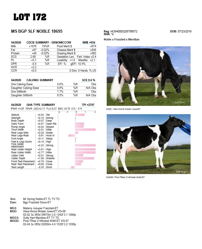 OFFICIAL ID: HO840003205756572 SIRE: Noble DAM: Sioux TPI: 2797 DWP: 785 NM$: 654 CM$: 648 DWP: 674 MILK: 1876 FAT: 67 PROTEIN: 48