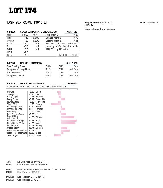 OFFICIAL ID: HO840003209480521 SIRE: Rome DAM: Noodle TPI: 2796 DWP: 894 NM$: 657 CM$: 673 DWP: 627 MILK: 1082 FAT: 52 PROTEIN: 39