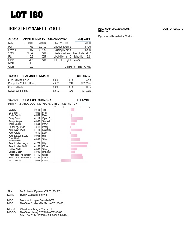 OFFICIAL ID: HO840003205756587 SIRE: Dynamo DAM: Mallory TPI: 2790 DWP: 878 NM$: 695 CM$: 709 DWP: 669 MILK: 1866 FAT: 69 PROTEIN: 62