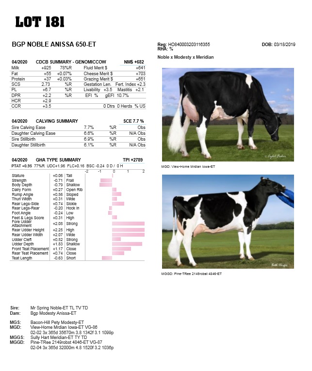 OFFICIAL ID: HO840003203116355 SIRE: Noble DAM: Anissa TPI: 2789 DWP: 779 NM$: 682 CM$: 703 DWP: 641 MILK: 925 FAT: 55 PROTEIN: 37
