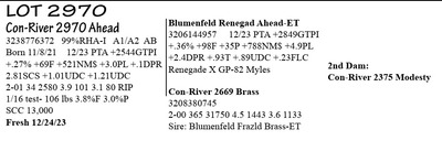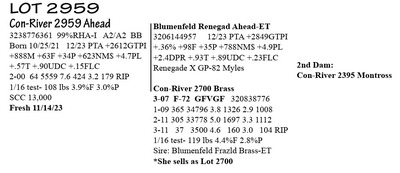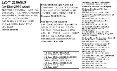 3238776370 99%RHA-I A1/A1 BB Born 11/6/21 12/23 PTA +2595GTPI +503M +40F +33P +573NM$ 2-01 12 579 6.2 36 3.8 22 RIP 1/16 test- 64 lbs 5.8%F 3.5%P SCC 54,000 Fresh 1/5/24