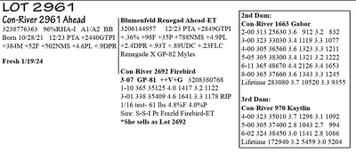 3238776366 99%RHA-I A1/A2 BB Born 11/2/21 12/23 PTA +2577GTPI 2-00 61 5365 9.0 481 2.6 140 RIP 1/16 test- 109 lbs 4.6%F 3.0%P SCC 31,000 Fresh 11/17/23