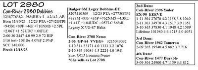 3238776391 99%RHA-I A1/A2 BE Born 12/15/21 12/23 PTA +2798GTPI +1287M +84F +54P +736NM$ +2.5PL +2.28T +1.91UDC +1.37FLC 1-11 38 3260 5.6 181 2.9 96 RIP 1/16 test- 102 lbs 5.3%F 2.8%P SCC 31,000 Fresh 12/10/23