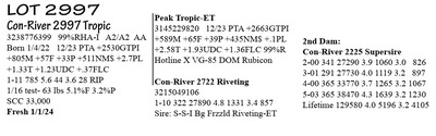 3238776401 99%RHA-I A2/A2 AA Born 1/6/22 12/23 PTA +2439GTPI +1571M +51P +418NM$ +4.0PL +.94T +1.55UDC 1-11 19 1273 3.8 48 3.5 44 RIP 1/19 test- 84 lns 3.4%F 3.1%P SCC 19,000 Fresh 12/29/23