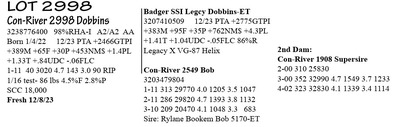 3238776398 99%RHA-I A1/A1 BB Born 1/2/22 12/23 PTA +2556GTPI +1443M +68F +42P +567NM$ +2.4PL +.83T +1.02UDC +.01FLC 1-11 26 2061 7.5 154 2.5 51 RIP 1/16 test- 95 lbs 7.6%F 2.5%P SCC 187,000 Fresh 12/22/23