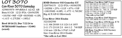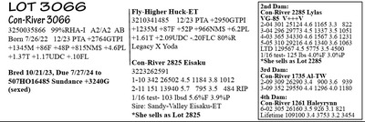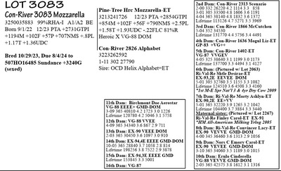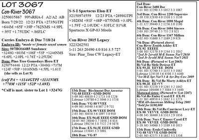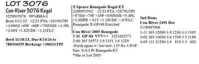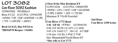 3250035884 99%RHA-I Born 9/3/22 12/23 PTA +2699GTPI +1746M +82F +53P +748NM$ +3.6PL +.81T +1.39UDC +.40FLC Carries Embryo & Due 7/18/24 Embryo ID: *made w/ female sexed semen Sire: 507HO16485 Sundance +3240G +803M +106F +53P +1246NM$ +8.6PL +2.0PL +1.76T +2.25UDC Dam: Con-River 3014-T Deluxe-ET*CD 3250035814 12/23 PTA +3087G +1795M +109F +65P +1079NM$ +5.6PL +2.10T (she sells as Lot 15) (calf PA = +3164GTPI +1163NM$ +1299M +108F +59P +2.18T)