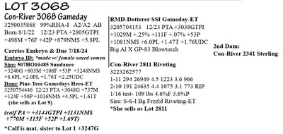 3250035867 99%RHA-I A2/A2 AB Born 7/29/22 12/23 PTA +2735GTPI +644M +65F +39P +762NM$ +4.9PL +.95T +1.75UDC +.86FLC Carries Embryo & Due 7/18/24 Embryo ID: *made w/ female sexed semen Sire: 507HO16485 Sundance +3240G +803M +106F +53P +1246NM$ +8.6PL +2.0PL +1.76T +2.25UDC Dam: Pine-Tree Gamedays Hero-ET 3250754446 12/23 PTA +3048G +737M +124F +50P +1016NM$ +4.5PL +1.61T (she sells as Lot 9) (calf PA = +3144GTPI +1131NM$ +770M +115F +52P +1.69T) *Calf is mat. sister to Lot 1 +3247G