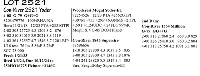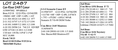 4-08 G-79 G+G+G 3203479776 100%RHA-NA Born 11/21/18 12/23 PTA +2331GTPI 2-02 305 27725 4.3 1204 3.2 876 3-02 310 34015 5.9 2021 3.3 1119 4-02 361 32557 4.7 1546 3.7 1201 RIP 1/16 test- 76 lbs 5.8%F 3.7%P SCC 23,000 Fresh 1/21/23 Bred 1/6/24, Due 10/12/24 to 250HO16775 Helmet +3146G