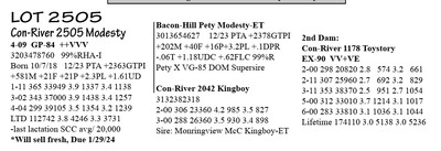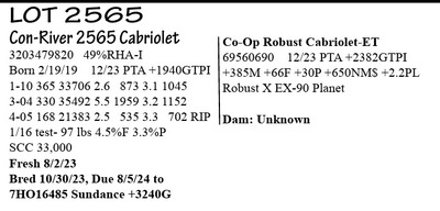 3203479814 99%RHA-I Born 2/9/19 12/23 PTA +2335GTPI +244M +33F +25P +2.5PL +1.50T 2-00 305 27853 3.7 1026 3.4 938 3-00 365 35664 4.5 1610 3.6 1268 4-07 105 13303 4.0 532 3.3 437 RIP 1/16 test- 124 lbs 4.2%F 3.1%P SCC 57,000 Fresh 10/4/23 Bred 12/1/23, Due 9/6/24 to 7HO16485 Sundance +3240G