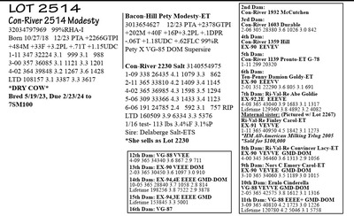 32034797969 99%RHA-I Born 10/27/18 12/23 PTA +2266GTPI +484M +33F +3.2PL +.71T +1.15UDC 1-11 347 32224 3.1 999 3.1 988 3-00 357 36085 3.1 1121 3.3 1201 4-02 364 39848 3.2 1267 3.6 1428 LTD 108157 3.1 3387 3.3 3617 *DRY COW* Bred 5/19/23, Due 2/23/24 to 7SM100