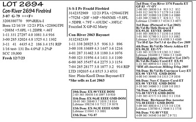 3215049108 99%RHA-I Born 2/18/20 12/23 PTA +2479GTPI +1342M +42F +26P +664NM$ +5.7PL 1-11 365 30370 3.4 1024 3.3 991 3-05 163 21588 4.1 875 3.1 672 RIP 1/16 test- 128 lbs 3.9%F 3.1%P SCC 13,000 Fresh 8/7/23 Bred 10/29/23, Due 8/4/24 to 7Ho16485 Sundance +3240G
