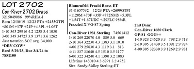 3-06 GP-83 V+V++ 3215049095 99%RHA-I Born 1/23/20 12/23 PTA +2526GTPI +388M +52F +37P +559NM$ +2.4PL 1-10 321 27397 4.5 1236 3.7 1022 2-11 280 29453 5.0 1459 3.6 1071 3-10 42 3919 4.2 165 2.8 109 RIP 1/16 test- 92 lbs 4.0%F 2.6%P SCC 19,000 Fresh 12/6/23