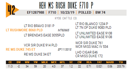 Sells bred 5/25/20 to HEH Silver Star C200 P ET. An own daughter of the $15,000 RE Ms Duke 745 ET female that topped a previous Sale of Excellence along with her heifer contributing another $2500.00. She descends from the highly successful donor, RE Ms Duke 34 ET, a direct daughter of the incomparable CR Miss Duke 172, the $20,000 Creighton Ranch Dispersal highlight! She ranks in the top 8% CE, 15% BW, 4% Milk and MTL for breed comparison EPDs. Silver Star is out of a “Pick of DeBruycker herd”, donor cow BHD Ms Silverlite P232!