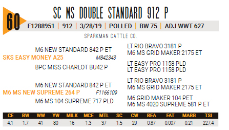 Sells Open, this line-bred New Standard heifer displays incredible femininity, good bone, and straight top. For numbers she ranks in the top 15% for WW, 7% YW, 15% Milk, 4% MTL, and 3% SC for breed EPDs. In carcass EPDs she also ranks high in CW and REA at top 15% category, 9% Marbling, and 6% TSI. With her light birth weight, growth, pedigree, and numbers this is an ideal selection!