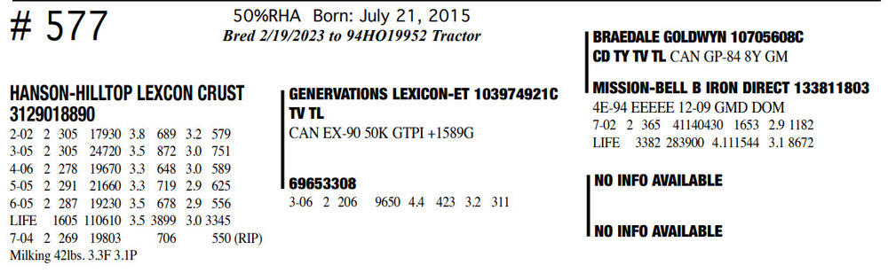 Milking 42lbs. 3.3F 3.1P 50%RHA Born: July 21, 2015