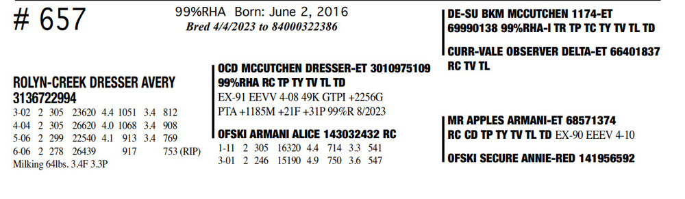 Milking 64lbs. 3.4F 3.3P 99%RHA Born: June 2, 2016