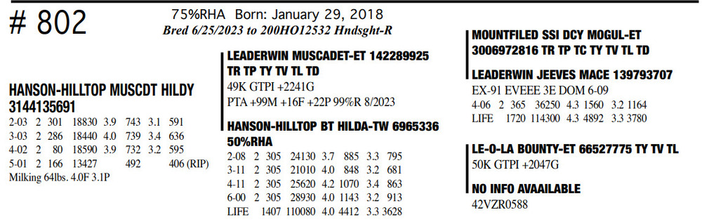 Milking 64lbs. 4.0F 3.1P 75%RHA Born: January 29, 2018