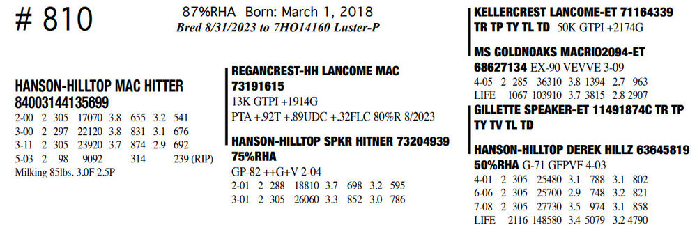 Milking 85lbs. 3.0F 2.5P 87%RHA Born: March 1, 2018