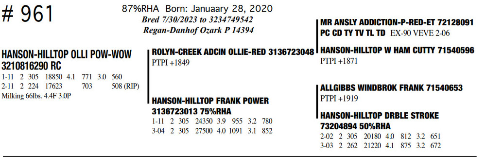 Milking 66lbs. 4.4F 3.0P 87%RHA Born: Januaary 28, 2020
