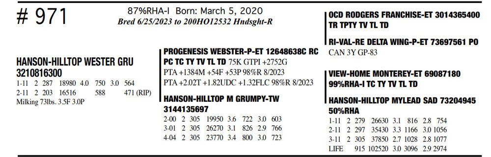 Milking 73lbs. 3.5F 3.0P 87%RHA-I Born: March 5, 2020