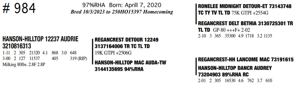 Milking 80lbs. 2.8F 2.8P 97%RHA Born: Aprill 7, 2020