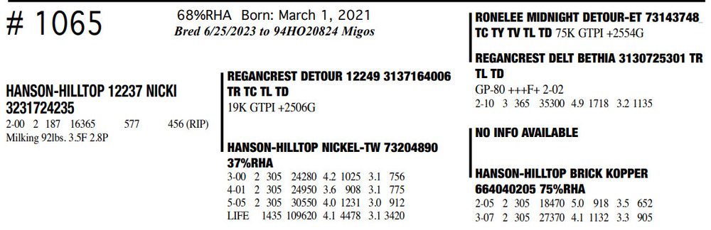 Milking 92lbs. 3.5F 2.8P 68%RHA Born: March 1, 2021