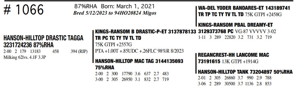 Milking 62lvs. 4.1F 3.3P 87%RHA Born: March 1, 2021