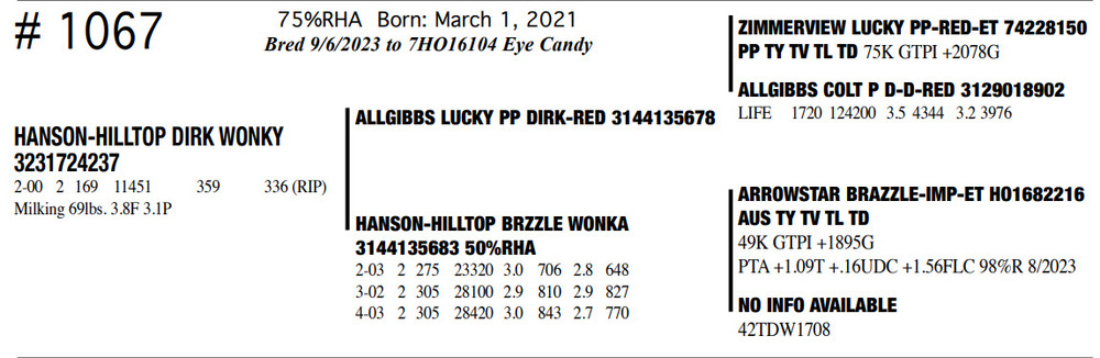 Milking 69lbs. 3.8F 3.1P 75%RHA Born: March 1, 2021