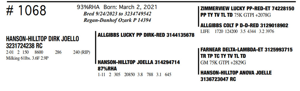 Milking 61lbs. 3.6F 2.9P93%RHA Born: March 2, 2021