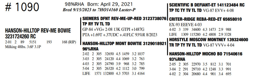 Milking 48lbs. 3.6F 3.1P 98%RHA Born: April 29, 2021