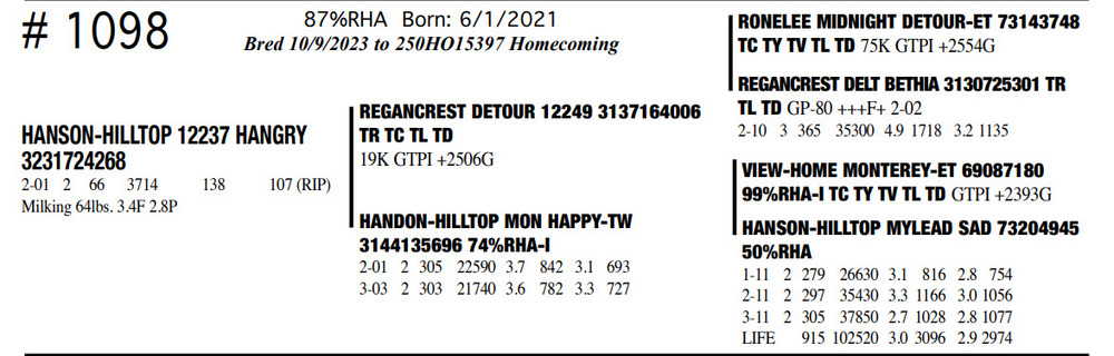 Milking 64lbs. 3.4F 2.8P 87%RHA Born: 6/1/2021