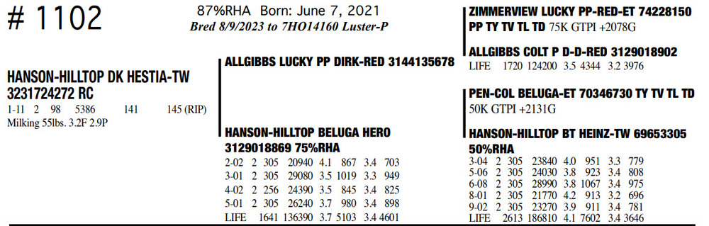 Milking 55lbs. 3.2F 2.9P 87%RHA Born: June 7, 2021
