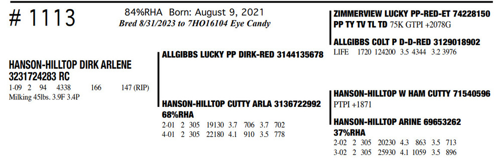 Milking 45lbs. 3.9F 3.4P 84%RHA Born: August 9, 2021