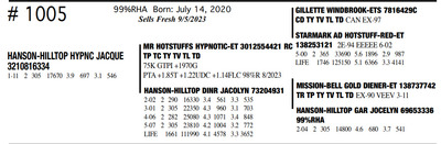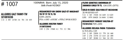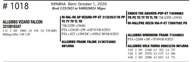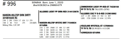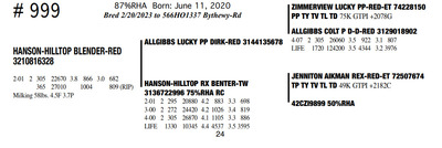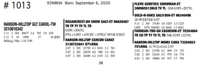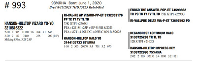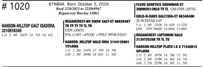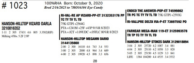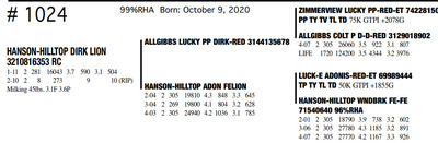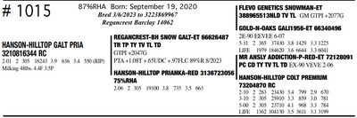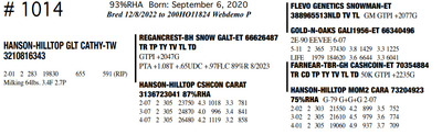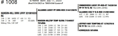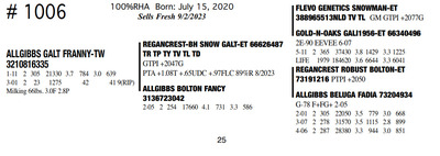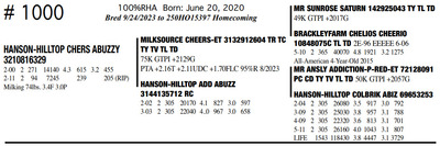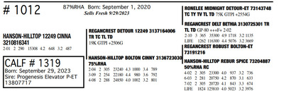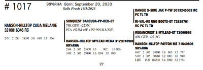 HANSON HILLTOP COMPLETE HERD DISPERSAL 1148 Round Praire Drive, Waukon IA, 52172 Great offering of genetics... Contact Agent: KALEB KRUSE - 563-880-7495 Catalog | Terms of Auction Download CATALOG Download UPDATES Download ADDED LOT 1 Download ADDED LOT 2 Download ADDED LOT 3 Catalog | Terms Download CATALOG Download UPDATES Download ADDED LOT 1 Download ADDED LOT 2 Download ADDED LOT 3 All Items (351) Cattle (351) Categories All Items (351) Cattle (351) Search Item #: Keyword: Search Catalog Item #: Keyword: 20 items per page 50 items per page 100 items per page Go to page #: 3 , 4 , 5 , 6 , 7 , 8 #993 – HANSON-HILLTOP VIZARD YO-YO 3210816322 2-00 2 305 21180 3.6 764 3.1 646 3-00 2 87 7440 236 200 (RIP) Milking 83lbs. 3.2F 2.8P 93%RHA Born: June 1, 2020 Bred 8/15/2023 7HO15825 Rebel-Red Location: 1148 Round Praire Drive, Waukon IA, 52172 Contact Agent: KALEB KRUSE - 563-880-7495 More Info / Bid Now Track this Item Sold High Bid: $2,450.00 – #20 #993 – HANSON-HILLTOP VIZARD YO-YO Sold High Bid: $2,450 More Details More Info / Bid Track Item 3210816322 2-00 2 305 21180 3.6 764 3.1 646 3-00 2 87 7440 236 200 (RIP) Milking 83lbs. 3.2F 2.8P 93%RHA Born: June 1, 2020 Bred 8/15/2023 7HO15825 Rebel-Red Location: 1148 Round Praire Drive, Waukon IA, 52172 Contact Agent: KALEB KRUSE - 563-880-7495 #996 – HANSON-HILLTOP DIRK DIRTY 3210816325 RC 2-00 2 298 17810 3.7 654 3.3 579 3-00 2 88 7113 275 210 (RIP) Milking 78lbs. 3.2F 2.9P 90%RHA Born: June 1, 2020 Bred 8/28/2023 to 250HO14579 Location: 1148 Round Praire Drive, Waukon IA, 52172 Contact Agent: KALEB KRUSE - 563-880-7495 More Info / Bid Now Track this Item Sold High Bid: $2,000.00 – #37 #996 – HANSON-HILLTOP DIRK DIRTY Sold High Bid: $2,000 More Details More Info / Bid Track Item 3210816325 RC 2-00 2 298 17810 3.7 654 3.3 579 3-00 2 88 7113 275 210 (RIP) Milking 78lbs. 3.2F 2.9P 90%RHA Born: June 1, 2020 Bred 8/28/2023 to 250HO14579 Location: 1148 Round Praire Drive, Waukon IA, 52172 Contact Agent: KALEB KRUSE - 563-880-7495 #999 – HANSON-HILLTOP BLENDER-RED 3210816328 2-01 2 305 22670 3.8 866 3.0 682 365 27010 1004 809 (RIP) Milking 58lbs. 4.5F 3.7P 87%RHA Born: June 11, 2020 Bred 2/20/2023 to 566HO1337 Bythewy-Rd Location: 1148 Round Praire Drive, Waukon IA, 52172 Contact Agent: KALEB KRUSE - 563-880-7495 More Info / Bid Now Track this Item Sold High Bid: $2,300.00 – #25 #999 – HANSON-HILLTOP BLENDER-RED Sold High Bid: $2,300 More Details More Info / Bid Track Item 3210816328 2-01 2 305 22670 3.8 866 3.0 682 365 27010 1004 809 (RIP) Milking 58lbs. 4.5F 3.7P 87%RHA Born: June 11, 2020 Bred 2/20/2023 to 566HO1337 Bythewy-Rd Location: 1148 Round Praire Drive, Waukon IA, 52172 Contact Agent: KALEB KRUSE - 563-880-7495 #1000 – HANSON-HILLTOP CHERS ABUZZY 3210816329 2-00 2 271 14140 4.3 615 3.2 455 2-11 2 94 7245 239 205 (RIP) Milking 74lbs. 3.4F 3.0P 100%RHA Born: June 20, 2020 Bred 9/24/2023 to 250HO15397 Homecoming Location: 1148 Round Praire Drive, Waukon IA, 52172 Contact Agent: KALEB KRUSE - 563-880-7495 More Info / Bid Now Track this Item Sold High Bid: $2,300.00 – #23 #1000 – HANSON-HILLTOP CHERS ABUZZY Sold High Bid: $2,300 More Details More Info / Bid Track Item 3210816329 2-00 2 271 14140 4.3 615 3.2 455 2-11 2 94 7245 239 205 (RIP) Milking 74lbs. 3.4F 3.0P 100%RHA Born: June 20, 2020 Bred 9/24/2023 to 250HO15397 Homecoming Location: 1148 Round Praire Drive, Waukon IA, 52172 Contact Agent: KALEB KRUSE - 563-880-7495 #1004 – HANSON-HILLTOP CHILE PARDI 3210816333 2-01 2 254 16390 4.1 670 3.1 502 3-00 2 57 4654 205 140 (RIP) Milking 83lbs. 3.5F 2.7P 99%RHA-I Born: July 12, 2020 Location: 1148 Round Praire Drive, Waukon IA, 52172 Contact Agent: KALEB KRUSE - 563-880-7495 More Info / Bid Now Track this Item Sold High Bid: $2,500.00 – #1006 #1004 – HANSON-HILLTOP CHILE PARDI Sold High Bid: $2,500 More Details More Info / Bid Track Item 3210816333 2-01 2 254 16390 4.1 670 3.1 502 3-00 2 57 4654 205 140 (RIP) Milking 83lbs. 3.5F 2.7P 99%RHA-I Born: July 12, 2020 Location: 1148 Round Praire Drive, Waukon IA, 52172 Contact Agent: KALEB KRUSE - 563-880-7495 #1005 – HANSON-HILLTOP HYPNC JACQUE 3210816334 1-11 2 305 17670 3.9 697 3.1 546 99%RHA Born: July 14, 2020 Sells Fresh 9/5/2023 Location: 1148 Round Praire Drive, Waukon IA, 52172 Contact Agent: KALEB KRUSE - 563-880-7495 More Info / Bid Now Track this Item Sold High Bid: $2,500.00 – #1006 #1005 – HANSON-HILLTOP HYPNC JACQUE Sold High Bid: $2,500 More Details More Info / Bid Track Item 3210816334 1-11 2 305 17670 3.9 697 3.1 546 99%RHA Born: July 14, 2020 Sells Fresh 9/5/2023 Location: 1148 Round Praire Drive, Waukon IA, 52172 Contact Agent: KALEB KRUSE - 563-880-7495 #1006 – ALLGIBBS GALT FRANNY-TW 3210816335 1-11 2 305 21330 3.7 784 3.0 639 3-01 2 23 1275 42 41 9(RIP) Milking 66lbs. 3.0F 2.8P 100%RHA Born: July 15, 2020 Sells Fresh 9/2/2023 Location: 1148 Round Praire Drive, Waukon IA, 52172 Contact Agent: KALEB KRUSE - 563-880-7495 More Info / Bid Now Track this Item Sold High Bid: $2,450.00 – #26 #1006 – ALLGIBBS GALT FRANNY-TW Sold High Bid: $2,450 More Details More Info / Bid Track Item 3210816335 1-11 2 305 21330 3.7 784 3.0 639 3-01 2 23 1275 42 41 9(RIP) Milking 66lbs. 3.0F 2.8P 100%RHA Born: July 15, 2020 Sells Fresh 9/2/2023 Location: 1148 Round Praire Drive, Waukon IA, 52172 Contact Agent: KALEB KRUSE - 563-880-7495 #1007 – ALLGIBBS GALT FANNY-TW 3210816336 1-11 2 305 21720 3.6 781 3.0 655 100%RHA Born: July 15, 2020 Sells Fresh 9/2/2023 Location: 1148 Round Praire Drive, Waukon IA, 52172 Contact Agent: KALEB KRUSE - 563-880-7495 More Info / Bid Now Track this Item No Bids Starting at $1,000.00 Login to Bid #1007 – ALLGIBBS GALT FANNY-TW Starting at $1,000.00 Login to Bid More Details More Info / Bid Track Item 3210816336 1-11 2 305 21720 3.6 781 3.0 655 100%RHA Born: July 15, 2020 Sells Fresh 9/2/2023 Location: 1148 Round Praire Drive, Waukon IA, 52172 Contact Agent: KALEB KRUSE - 563-880-7495 #1008 – HANSON-HILL DIRK LIVVY 3210816337