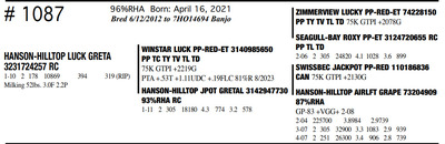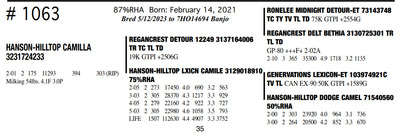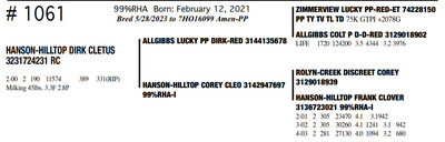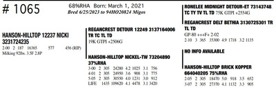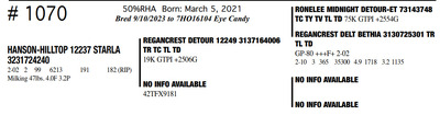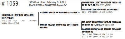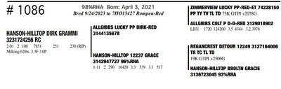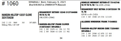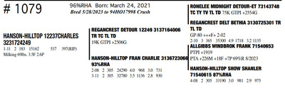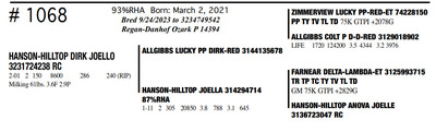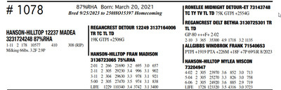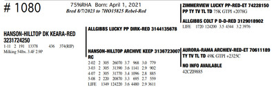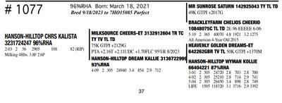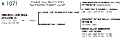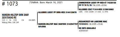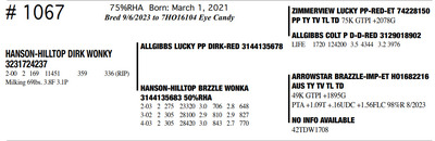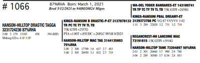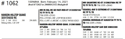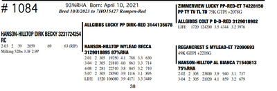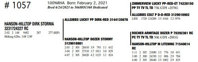 HANSON HILLTOP COMPLETE HERD DISPERSAL 1148 Round Praire Drive, Waukon IA, 52172 Great offering of genetics... Contact Agent: KALEB KRUSE - 563-880-7495 Catalog | Terms of Auction Download CATALOG Download UPDATES Download ADDED LOT 1 Download ADDED LOT 2 Download ADDED LOT 3 Catalog | Terms Download CATALOG Download UPDATES Download ADDED LOT 1 Download ADDED LOT 2 Download ADDED LOT 3 All Items (351) Cattle (351) Categories All Items (351) Cattle (351) Search Item #: Keyword: Search Catalog Item #: Keyword: 20 items per page 50 items per page 100 items per page Go to page #: 5 , 6 , 7 , 8 , 9 , 10 #1057 – HANSON-HILLTOP DIRK STORMA 3231724227 RC 2-02 2 148 9482 287 277 (RIP) Milking 62lbs. 3.0F 2.9P 100%RHA Born: February 2, 2021 Bred 6/24/2023 to 566HO1360 Dedicated Location: 1148 Round Praire Drive, Waukon IA, 52172 Contact Agent: KALEB KRUSE - 563-880-7495 More Info / Bid Now Track this Item Sold High Bid: $2,250.00 – #4 #1057 – HANSON-HILLTOP DIRK STORMA Sold High Bid: $2,250 More Details More Info / Bid Track Item 3231724227 RC 2-02 2 148 9482 287 277 (RIP) Milking 62lbs. 3.0F 2.9P 100%RHA Born: February 2, 2021 Bred 6/24/2023 to 566HO1360 Dedicated Location: 1148 Round Praire Drive, Waukon IA, 52172 Contact Agent: KALEB KRUSE - 563-880-7495 #1059 – HANSON-HILLTOP DRK YAYA-RED 3231724229 2-00 2 209 11520 453 367 (RIP) Milking 55lbs. 4.2F 3.4P 99%RHA Born: February 9, 2021 Bred 6/9/2023 to 566HO1336 Rngldr-Rd Location: 1148 Round Praire Drive, Waukon IA, 52172 Contact Agent: KALEB KRUSE - 563-880-7495 More Info / Bid Now Track this Item Sold High Bid: $1,750.00 – #12 #1059 – HANSON-HILLTOP DRK YAYA-RED Sold High Bid: $1,750 More Details More Info / Bid Track Item 3231724229 2-00 2 209 11520 453 367 (RIP) Milking 55lbs. 4.2F 3.4P 99%RHA Born: February 9, 2021 Bred 6/9/2023 to 566HO1336 Rngldr-Rd Location: 1148 Round Praire Drive, Waukon IA, 52172 Contact Agent: KALEB KRUSE - 563-880-7495 #1060 – HANSON-HILLTOP 12237 CLOVE 3231724230 2-02 2 133 9869 343 307 (RIP) Milking 78lbs. 3.2F 3.0P 99%RHA-I Born: February 9, 2021 Bred 8/8/2023 to 250HO14579 Hancock Location: 1148 Round Praire Drive, Waukon IA, 52172 Contact Agent: KALEB KRUSE - 563-880-7495 More Info / Bid Now Track this Item Sold High Bid: $3,300.00 – #20 #1060 – HANSON-HILLTOP 12237 CLOVE Sold High Bid: $3,300 More Details More Info / Bid Track Item 3231724230 2-02 2 133 9869 343 307 (RIP) Milking 78lbs. 3.2F 3.0P 99%RHA-I Born: February 9, 2021 Bred 8/8/2023 to 250HO14579 Hancock Location: 1148 Round Praire Drive, Waukon IA, 52172 Contact Agent: KALEB KRUSE - 563-880-7495 #1061 – HANSON-HILLTOP DIRK CLETUS 3231724231 RC 2-00 2 190 11574 389 331(RIP) Milking 45lbs. 3.3F 2.8P 99%RHA Born: February 12, 2021 Bred 5/28/2023 to 7HO16099 Amen-PP Location: 1148 Round Praire Drive, Waukon IA, 52172 Contact Agent: KALEB KRUSE - 563-880-7495 More Info / Bid Now Track this Item Sold High Bid: $2,500.00 – #1005 #1061 – HANSON-HILLTOP DIRK CLETUS Sold High Bid: $2,500 More Details More Info / Bid Track Item 3231724231 RC 2-00 2 190 11574 389 331(RIP) Milking 45lbs. 3.3F 2.8P 99%RHA Born: February 12, 2021 Bred 5/28/2023 to 7HO16099 Amen-PP Location: 1148 Round Praire Drive, Waukon IA, 52172 Contact Agent: KALEB KRUSE - 563-880-7495 #1062 – HANSON-HILLTOP QUAKE 3231724232 RC 2-01 2 148 10313 388 290 (RIP) Milking 64lbs. 3.2F 2.9P 100%RHA Born: February 14, 2021 Bred 8/7/2023 to 200HO12532 Hndsght-R Location: 1148 Round Praire Drive, Waukon IA, 52172 Contact Agent: KALEB KRUSE - 563-880-7495 More Info / Bid Now Track this Item Sold High Bid: $1,500.00 – #1005 #1062 – HANSON-HILLTOP QUAKE Sold High Bid: $1,500 More Details More Info / Bid Track Item 3231724232 RC 2-01 2 148 10313 388 290 (RIP) Milking 64lbs. 3.2F 2.9P 100%RHA Born: February 14, 2021 Bred 8/7/2023 to 200HO12532 Hndsght-R Location: 1148 Round Praire Drive, Waukon IA, 52172 Contact Agent: KALEB KRUSE - 563-880-7495 #1063 – HANSON-HILLTOP CAMILLA 3231724233 2-01 2 175 11293 394 303 (RIP) Milking 54lbs. 4.1F 3.0P 87%RHA Born: February 14, 2021 Bred 5/12/2023 to 7HO14694 Banjo Location: 1148 Round Praire Drive, Waukon IA, 52172 Contact Agent: KALEB KRUSE - 563-880-7495 More Info / Bid Now Track this Item Sold High Bid: $1,425.00 – #18 #1063 – HANSON-HILLTOP CAMILLA Sold High Bid: $1,425 More Details More Info / Bid Track Item 3231724233 2-01 2 175 11293 394 303 (RIP) Milking 54lbs. 4.1F 3.0P 87%RHA Born: February 14, 2021 Bred 5/12/2023 to 7HO14694 Banjo Location: 1148 Round Praire Drive, Waukon IA, 52172 Contact Agent: KALEB KRUSE - 563-880-7495 #1065 – HANSON-HILLTOP 12237 NICKI 3231724235 2-00 2 187 16365 577 456 (RIP) Milking 92lbs. 3.5F 2.8P 68%RHA Born: March 1, 2021 Bred 6/25/2023 to 94HO20824 Migos Location: 1148 Round Praire Drive, Waukon IA, 52172 Contact Agent: KALEB KRUSE - 563-880-7495 More Info / Bid Now Track this Item Sold High Bid: $2,450.00 – #1006 #1065 – HANSON-HILLTOP 12237 NICKI Sold High Bid: $2,450 More Details More Info / Bid Track Item 3231724235 2-00 2 187 16365 577 456 (RIP) Milking 92lbs. 3.5F 2.8P 68%RHA Born: March 1, 2021 Bred 6/25/2023 to 94HO20824 Migos Location: 1148 Round Praire Drive, Waukon IA, 52172 Contact Agent: KALEB KRUSE - 563-880-7495 #1066 – HANSON-HILLTOP DRASTIC TAGGA 3231724236 87%RHA 2-00 2 179 13183 458 394 (RIP) Milking 62lvs. 4.1F 3.3P 87%RHA Born: March 1, 2021 Bred 5/12/2023 to 94HO20824 Migos Location: 1148 Round Praire Drive, Waukon IA, 52172 Contact Agent: KALEB KRUSE - 563-880-7495 More Info / Bid Now Track this Item Sold High Bid: $2,200.00 – #26 #1066 – HANSON-HILLTOP DRASTIC TAGGA Sold High Bid: $2,200 More Details More Info / Bid Track Item 3231724236 87%RHA 2-00 2 179 13183 458 394 (RIP) Milking 62lvs. 4.1F 3.3P 87%RHA Born: March 1, 2021 Bred 5/12/2023 to 94HO20824 Migos Location: 1148 Round Praire Drive, Waukon IA, 52172 Contact Agent: KALEB KRUSE - 563-880-7495 #1067 – HANSON-HILLTOP DIRK WONKY 3231724237 2-00 2 169 11451 359 336 (RIP) Milking 69lbs. 3.8F 3.1P 75%RH