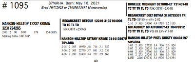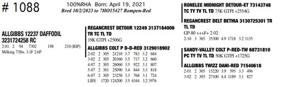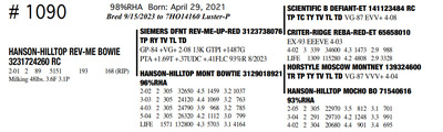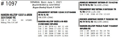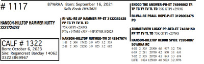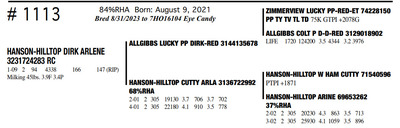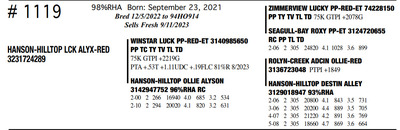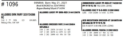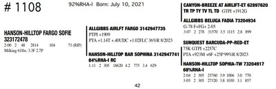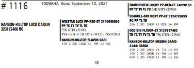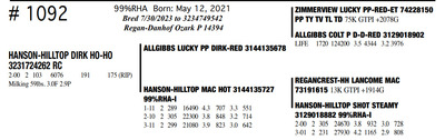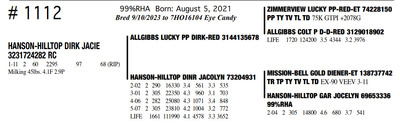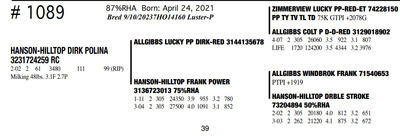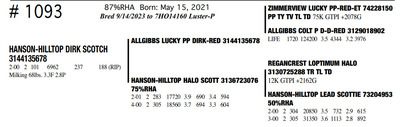 HANSON HILLTOP COMPLETE HERD DISPERSAL 1148 Round Praire Drive, Waukon IA, 52172 Great offering of genetics... Contact Agent: KALEB KRUSE - 563-880-7495 Catalog | Terms of Auction Download CATALOG Download UPDATES Download ADDED LOT 1 Download ADDED LOT 2 Download ADDED LOT 3 Catalog | Terms Download CATALOG Download UPDATES Download ADDED LOT 1 Download ADDED LOT 2 Download ADDED LOT 3 All Items (351) Cattle (351) Categories All Items (351) Cattle (351) Search Item #: Keyword: Search Catalog Item #: Keyword: 20 items per page 50 items per page 100 items per page Go to page #: 6 , 7 , 8 , 9 , 10 , 11 #1088 – ALLGIBBS 12237 DAFFODIL 3231724258 RC 2-01 2 94 7302 198 210 (RIP) Milking 73lbs. 3.1F 2.6P 100%RHA Born: April 19, 2021 Bred 10/2/2023 to 7HO15427 Rompen-Red Location: 1148 Round Praire Drive, Waukon IA, 52172 Contact Agent: KALEB KRUSE - 563-880-7495 More Info / Bid Now Track this Item Sold High Bid: $2,500.00 – #4 #1088 – ALLGIBBS 12237 DAFFODIL Sold High Bid: $2,500 More Details More Info / Bid Track Item 3231724258 RC 2-01 2 94 7302 198 210 (RIP) Milking 73lbs. 3.1F 2.6P 100%RHA Born: April 19, 2021 Bred 10/2/2023 to 7HO15427 Rompen-Red Location: 1148 Round Praire Drive, Waukon IA, 52172 Contact Agent: KALEB KRUSE - 563-880-7495 #1089 – HANSON-HILLTOP DIRK POLINA 3231724259 RC 2-02 2 61 3480 111 99 (RIP) Milking 48lbs. 3.1F 2.7P 87%RHA Born: April 24, 2021 Bred 9/10/20237HO14160 Luster-P Location: 1148 Round Praire Drive, Waukon IA, 52172 Contact Agent: KALEB KRUSE - 563-880-7495 More Info / Bid Now Track this Item No Bids Starting at $1,000.00 Login to Bid #1089 – HANSON-HILLTOP DIRK POLINA Starting at $1,000.00 Login to Bid More Details More Info / Bid Track Item 3231724259 RC 2-02 2 61 3480 111 99 (RIP) Milking 48lbs. 3.1F 2.7P 87%RHA Born: April 24, 2021 Bred 9/10/20237HO14160 Luster-P Location: 1148 Round Praire Drive, Waukon IA, 52172 Contact Agent: KALEB KRUSE - 563-880-7495 #1090 – HANSON-HILLTOP REV-ME BOWIE 3231724260 RC 2-01 2 89 5151 193 168 (RIP) Milking 48lbs. 3.6F 3.1P 98%RHA Born: April 29, 2021 Bred 9/15/2023 to 7HO14160 Luster-P Location: 1148 Round Praire Drive, Waukon IA, 52172 Contact Agent: KALEB KRUSE - 563-880-7495 More Info / Bid Now Track this Item Sold High Bid: $2,100.00 – #1005 #1090 – HANSON-HILLTOP REV-ME BOWIE Sold High Bid: $2,100 More Details More Info / Bid Track Item 3231724260 RC 2-01 2 89 5151 193 168 (RIP) Milking 48lbs. 3.6F 3.1P 98%RHA Born: April 29, 2021 Bred 9/15/2023 to 7HO14160 Luster-P Location: 1148 Round Praire Drive, Waukon IA, 52172 Contact Agent: KALEB KRUSE - 563-880-7495 #1092 – HANSON-HILLTOP DIRK HO-HO 3231724262 RC 2-00 2 103 6076 191 175 (RIP) Milking 59lbs. 3.0F 2.9P 99%RHA Born: May 12, 2021 Bred 7/30/2023 to 3234749542 Regan-Danhof Ozark P 14394 Location: 1148 Round Praire Drive, Waukon IA, 52172 Contact Agent: KALEB KRUSE - 563-880-7495 More Info / Bid Now Track this Item Sold High Bid: $2,050.00 – #1008 #1092 – HANSON-HILLTOP DIRK HO-HO Sold High Bid: $2,050 More Details More Info / Bid Track Item 3231724262 RC 2-00 2 103 6076 191 175 (RIP) Milking 59lbs. 3.0F 2.9P 99%RHA Born: May 12, 2021 Bred 7/30/2023 to 3234749542 Regan-Danhof Ozark P 14394 Location: 1148 Round Praire Drive, Waukon IA, 52172 Contact Agent: KALEB KRUSE - 563-880-7495 #1093 – HANSON-HILLTOP DIRK SCOTCH 3144135678 2-00 2 101 6962 237 188 (RIP) Milking 68lbs. 3.3F 2.8P 87%RHA Born: May 15, 2021 Bred 9/14/2023 to 7HO14160 Luster-P Location: 1148 Round Praire Drive, Waukon IA, 52172 Contact Agent: KALEB KRUSE - 563-880-7495 More Info / Bid Now Track this Item Sold High Bid: $2,550.00 – #1005 #1093 – HANSON-HILLTOP DIRK SCOTCH Sold High Bid: $2,550 More Details More Info / Bid Track Item 3144135678 2-00 2 101 6962 237 188 (RIP) Milking 68lbs. 3.3F 2.8P 87%RHA Born: May 15, 2021 Bred 9/14/2023 to 7HO14160 Luster-P Location: 1148 Round Praire Drive, Waukon IA, 52172 Contact Agent: KALEB KRUSE - 563-880-7495 #1095 – HANSON-HILLTOP 12237 KRIMA 3231724265 2-00 2 90 5497 178 154 (RIP) Milking 64lbs. 3.8F 3.0P 87%RHA Born: May 18, 2021 Bred 10/7/2023 to 250HO15397 Homecoming Location: 1148 Round Praire Drive, Waukon IA, 52172 Contact Agent: KALEB KRUSE - 563-880-7495 More Info / Bid Now Track this Item No Bids Starting at $1,000.00 Login to Bid #1095 – HANSON-HILLTOP 12237 KRIMA Starting at $1,000.00 Login to Bid More Details More Info / Bid Track Item 3231724265 2-00 2 90 5497 178 154 (RIP) Milking 64lbs. 3.8F 3.0P 87%RHA Born: May 18, 2021 Bred 10/7/2023 to 250HO15397 Homecoming Location: 1148 Round Praire Drive, Waukon IA, 52172 Contact Agent: KALEB KRUSE - 563-880-7495 #1096 – ALLGIBBS DIRK FAIRY 3231724266 RC 2-01 2 77 3928 123 109 (RIP) Milking 47lbs. 3.0F 3.0P 99%RHA Born: May 21, 2021 Bred 8/20/2023 to 3234749542 Regan-Danhof Ozark P 14394 Location: 1148 Round Praire Drive, Waukon IA, 52172 Contact Agent: KALEB KRUSE - 563-880-7495 More Info / Bid Now Track this Item Sold High Bid: $1,700.00 – #31 #1096 – ALLGIBBS DIRK FAIRY 3231724266 Sold High Bid: $1,700 More Details More Info / Bid Track Item RC 2-01 2 77 3928 123 109 (RIP) Milking 47lbs. 3.0F 3.0P 99%RHA Born: May 21, 2021 Bred 8/20/2023 to 3234749542 Regan-Danhof Ozark P 14394 Location: 1148 Round Praire Drive, Waukon IA, 52172 Contact Agent: KALEB KRUSE - 563-880-7495 #1097 – HANSON-HILLTOP 12237 A-ARON 3231724267 RC 2-00 2 81 5414 181 147(RIP) Milking 73lbs 3.1F 2.6P 99%RHA Born: June 1, 2021 Bred 8/18/2023 to 3234749542 Regan-Danhof Ozark P 14394 Location: 1148 Round Praire Drive, Waukon IA, 52172 Contact Agent: KALEB KRUSE - 563-880-7495 More Info / Bid Now Track this Item Sold High Bid: $2,500.00 – #1005 #1097 – HANSON-HILLTOP 12237 A-ARON Sold High Bid: $2,500 More Details More Info / Bid Track Item 3231724267 RC 2-00 2 81 5414 181 147(RIP) Milking 73lbs 3.1F 2.6P 99%RHA Born: June 1, 2021 Bred 8/18/2023 to 3234749542 Regan-Danhof Ozark P 14394 Location: 1148 Round Praire Drive, Waukon IA, 52172 Contact Agent: KALEB KRUSE - 563-880-7495 #1098 –