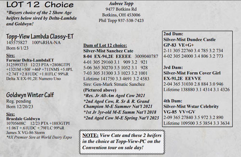Born 12/20/23 Sire: Braedale Goldwyn 10705608C 12/23 PTA +1883GTPI +1.06T +.61UDC +.79FLC 99%R James X VG-86 Storm *8X Premier Sire at World Dairy Expo