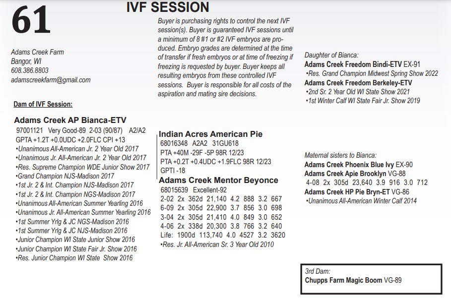 Dam of IVF Session: Adams Creek AP Bianca-ETV Buyer is purchasing rights to control the next IVF