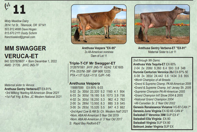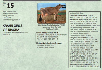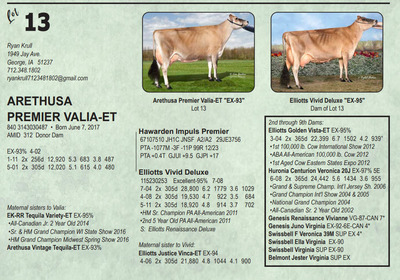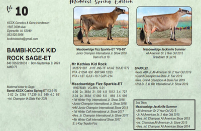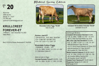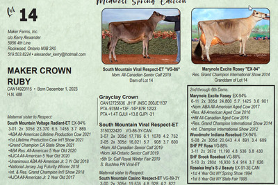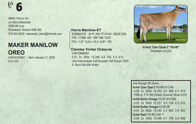 Midwest Spring Edition Sale at Do-N-Joy Genetics 40917 296TH ST , Arlington MN, 55307 Live lots - IVF Sessions - Embryos - Elite Choices Contact Agent: Catalog | Terms of Auction Download CATALOG Download SALE ORDER Download ADDED LOTS Download UPDATES Catalog | Terms Download CATALOG Download SALE ORDER Download ADDED LOTS Download UPDATES All Items (141) Cattle (141) Categories All Items (141) Cattle (141) Search Item #: Keyword: Search Catalog Item #: Keyword: 20 items per page 50 items per page 100 items per page Go to page #: 1 , 2 , 3 , 4 , 5 , 6 #1 – SOUTH MOUNTAIN VICTORIOUS CAMRYN-ET 840 3267669617 Born September 9, 2023 AMID 531 Location: 40917 296TH ST , Arlington MN, 55307 More Info / Bid Now Track this Item Sold High Bid: $6,800.00 – #167 #1 – SOUTH MOUNTAIN VICTORIOUS CAMRYN-ET Sold High Bid: $6,800 More Details More Info / Bid Track Item 840 3267669617 Born September 9, 2023 AMID 531 Location: 40917 296TH ST , Arlington MN, 55307 #2 – KILGUS COLTON GOLD 840 3151204264 Born September 14, 2022 AMID 1360 Bred 9/17/23 to River Valley Victorious-ET 507JE5032 (sexed) Location: 40917 296TH ST , Arlington MN, 55307 More Info / Bid Now Track this Item Sold High Bid: $2,750.00 – #89 #2 – KILGUS COLTON GOLD Sold High Bid: $2,750 More Details More Info / Bid Track Item 840 3151204264 Born September 14, 2022 AMID 1360 Bred 9/17/23 to River Valley Victorious-ET 507JE5032 (sexed) Location: 40917 296TH ST , Arlington MN, 55307 #3 – SCHULTE BROS COLTON FALLON-ET 175057663 Born June 10, 2023 Tattoo S896 Location: 40917 296TH ST , Arlington MN, 55307 More Info / Bid Now Track this Item Sold High Bid: $8,600.00 – #95 #3 – SCHULTE BROS COLTON FALLON-ET Sold High Bid: $8,600 More Details More Info / Bid Track Item 175057663 Born June 10, 2023 Tattoo S896 Location: 40917 296TH ST , Arlington MN, 55307 #4 – SCHULTE BROS COLTON 4 FANTASTICO-ET 174868165 Born June 19, 2022 Tattoo S844 Bred 7/22/23 to MM Victorious Frank-ET 551JE1775 (sexed) Location: 40917 296TH ST , Arlington MN, 55307 More Info / Bid Now Track this Item Sold High Bid: $3,500.00 – #95 #4 – SCHULTE BROS COLTON 4 FANTASTICO-ET Sold High Bid: $3,500 More Details More Info / Bid Track Item 174868165 Born June 19, 2022 Tattoo S844 Bred 7/22/23 to MM Victorious Frank-ET 551JE1775 (sexed) Location: 40917 296TH ST , Arlington MN, 55307 #5 – DISCOVERYS VICTORIOUS JUJUBA 174968258 Born April 1, 2023 Tattoo 51LD Location: 40917 296TH ST , Arlington MN, 55307 More Info / Bid Now Track this Item Sold High Bid: $3,100.00 – #1017 #5 – DISCOVERYS VICTORIOUS JUJUBA Sold High Bid: $3,100 More Details More Info / Bid Track Item 174968258 Born April 1, 2023 Tattoo 51LD Location: 40917 296TH ST , Arlington MN, 55307 #6 – MAKER MANILOW OREO CAN14143461 Born January 11, 2022 H.N. 413 Location: 40917 296TH ST , Arlington MN, 55307 More Info / Bid Now Track this Item Sold High Bid: $2,000.00 – #93 #6 – MAKER MANILOW OREO Sold High Bid: $2,000 More Details More Info / Bid Track Item CAN14143461 Born January 11, 2022 H.N. 413 Location: 40917 296TH ST , Arlington MN, 55307 #7 – MISH-RO BONTINO PETRA {6} 174574572 Born November 18, 2021 Tattoo R49 Fresh: December 2, 2023 Bred 3/09/24 to Vierra Sting-ET 777JE1376 (sexed Location: 40917 296TH ST , Arlington MN, 55307 More Info / Bid Now Track this Item Sold High Bid: $2,050.00 – #93 #7 – MISH-RO BONTINO PETRA {6} Sold High Bid: $2,050 More Details More Info / Bid Track Item 174574572 Born November 18, 2021 Tattoo R49 Fresh: December 2, 2023 Bred 3/09/24 to Vierra Sting-ET 777JE1376 (sexed Location: 40917 296TH ST , Arlington MN, 55307 #8 – SCHULTE BROS JOEL CANDY-ET 175073935 Born September 1, 2023 Tattoo S903 Location: 40917 296TH ST , Arlington MN, 55307 More Info / Bid Now Track this Item Sold High Bid: $2,900.00 – #180 #8 – SCHULTE BROS JOEL CANDY-ET Sold High Bid: $2,900 More Details More Info / Bid Track Item 175073935 Born September 1, 2023 Tattoo S903 Location: 40917 296TH ST , Arlington MN, 55307 #9 – WOODMOHR REVIRESCO DAKOTA-ET 175017991 Born June 16, 2023 Tattoo WMF466 Location: 40917 296TH ST , Arlington MN, 55307 More Info / Bid Now Track this Item Sold High Bid: $5,500.00 – #181 #9 – WOODMOHR REVIRESCO DAKOTA-ET Sold High Bid: $5,500 More Details More Info / Bid Track Item 175017991 Born June 16, 2023 Tattoo WMF466 Location: 40917 296TH ST , Arlington MN, 55307 #10 – BAMBI-KCCK KID ROCK SAGE-ET 840 3252228533 Born September 9, 2023 AMID 77 Location: 40917 296TH ST , Arlington MN, 55307 More Info / Bid Now Track this Item Sold High Bid: $6,000.00 – #12 #10 – BAMBI-KCCK KID ROCK SAGE-ET Sold High Bid: $6,000 More Details More Info / Bid Track Item 840 3252228533 Born September 9, 2023 AMID 77 Location: 40917 296TH ST , Arlington MN, 55307 #11 – MM SWAGGER VERUCA-ET 840 3257829607 Born December 1, 2022 AMID 21726 JH1C JNS-TF Location: 40917 296TH ST , Arlington MN, 55307 More Info / Bid Now Track this Item Sold High Bid: $2,400.00 – #91 #11 – MM SWAGGER VERUCA-ET Sold High Bid: $2,400 More Details More Info / Bid Track Item 840 3257829607 Born December 1, 2022 AMID 21726 JH1C JNS-TF Location: 40917 296TH ST , Arlington MN, 55307 #12 – HEATHS NUANCE HAVANA 174924368 Born September 23, 2022 Tattoo R920 Bred 10/09/23 to WF Joel Golddust Location: 40917 296TH ST , Arlington MN, 55307 More Info / Bid Now Track this Item Sold High Bid: $2,000.00 – #93 #12 – HEATHS NUANCE HAVANA Sold High Bid: $2,000 More Details More Info / Bid Track Item 174924368 Born September 23, 2022 Tattoo R920 Bred 10/09/23 to WF Joel Golddust Location: 40917 296TH ST , Arlington MN, 55307 #13 – ARETHUSA PREMIER VALIA-ET 840 3143030487 Born June 7, 2017 AMID 312 Donor Dam EX-93% 4-02 1-11 2x 256d 12,920 5.3 683 3.8 487 5-01 2x 305d 12,020 5.1 615 4.0 480 Location: 40917 296TH ST , Arlington MN, 55307 More Info / Bid Now Track this Item No Bids Starting at $1,000.00 #13 – ARETHUSA PREMIER VALIA-ET Starting at $1,000.00 More Details More Info / Bid Track Item
