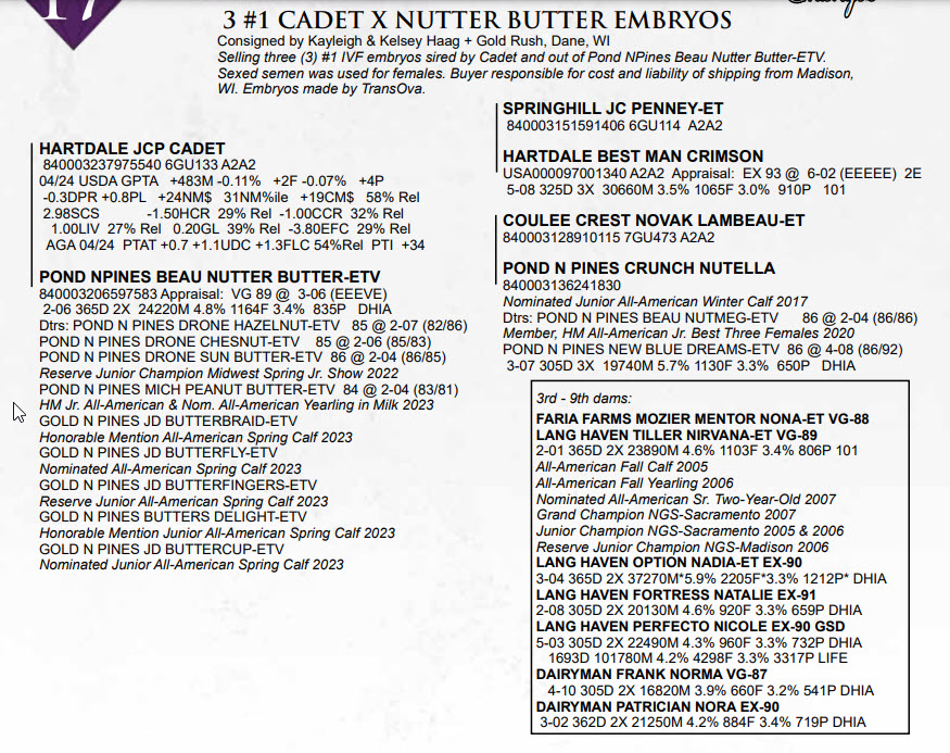 Selling three (3) #1 IVF embryos sired by Cadet and out of Pond NPines Beau Nutter Butter-ETV.