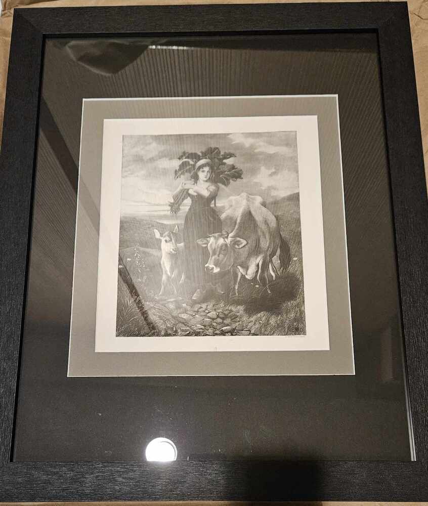 It is a framed print from 1881 called Alderney with a dairy maid and cow and calf.