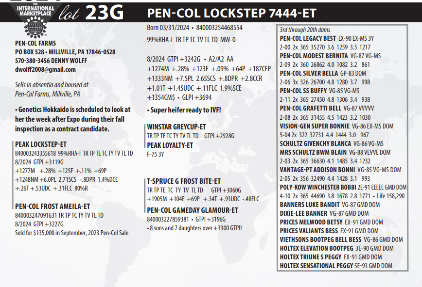 Sells in absentia and housed at Pen-Col Farms, Millville, PA