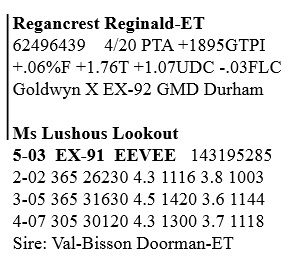 2-05 VG-85 +V++V 3140437725 99%RHA-I Born 3/1/13 A2/A2 2-01 303 31184 3.8 804 3.2 677 3-01 66 6776 3.2 220 2.8 187 RIP Last trest- 117 lbs SCC 33,000 Fresh 4/12/20 Bred 6/26/20, Due 3/31/21 to 94HO10276 Dundee
