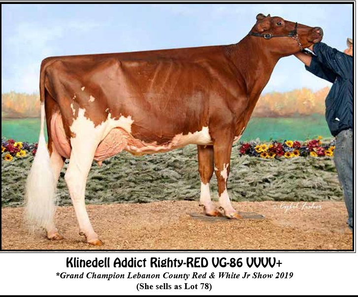 4-02 VG-86 VVVV+ 3135447212 100%RHA-NA Born 4/12/16 2-02 252 12950 3.7 473 3.5 459 3-00 326 20710 3.7 765 3.5 721 Fresh 5/29/20 w/ 3rd calf Bred 7/19/20 to 76HO1603 Awesome-RED *Grand Champion Lebanon County Red & White Jr Show 2019 *Res. Grand Champion Leb. County Red &White Open Show 2019 (Pictured above)