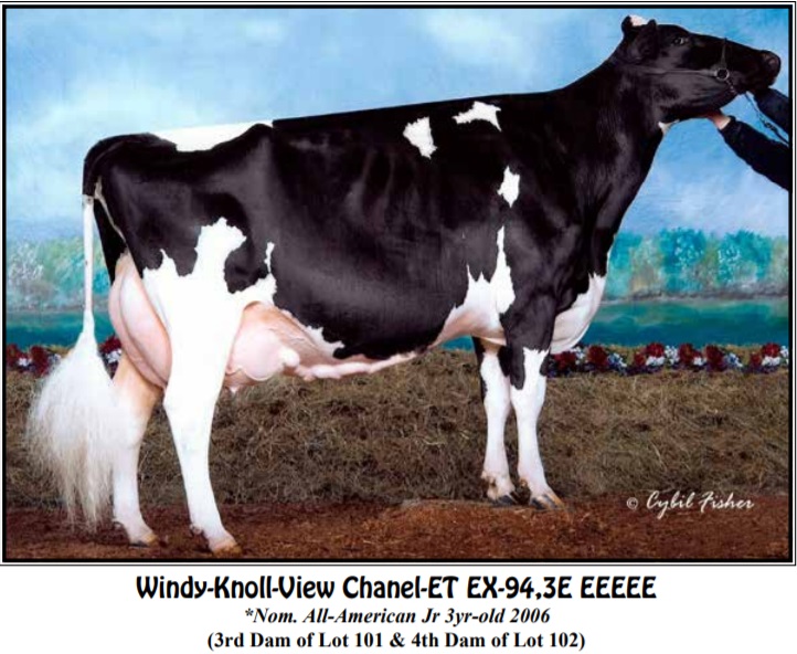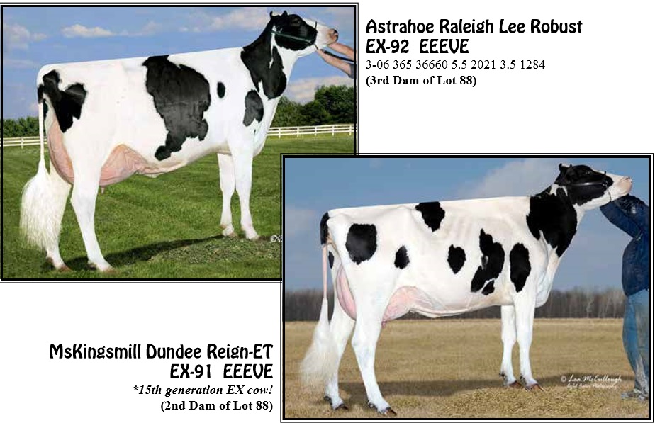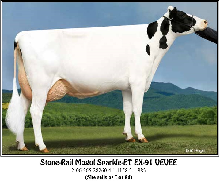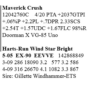 5-11 EX-91 VEVEE 72123317 100%RHA-NA Born 1/5/13 4/20 PTA +2317GTPI +826M +20F +3.8PL +.2DPR +.94T 2-06 365 28260 4.1 1158 3.1 883 Fresh 7/16/20 -milking 100 lbs/day *Sold for $62,500 in 2013 National Convention Sale *Sons at Cogent & Accelerated *Embryos exported to Japan, Germany, Netherlands & United Kingdom