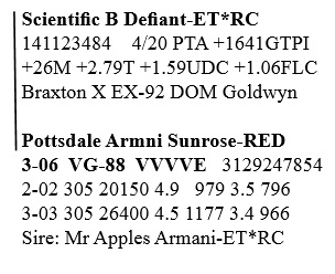 4-00 GP-83 +VG++ 72198160 100%RHA-NA Born 3/3/15 1-09 305 15350 3.9 592 3.0 460 2-09 232 13120 3.4 449 3.4 448 3-08 305 18862 3.6 688 3.0 571 Fresh 8/1/20 w/ 4th calf *Potential EX cow!