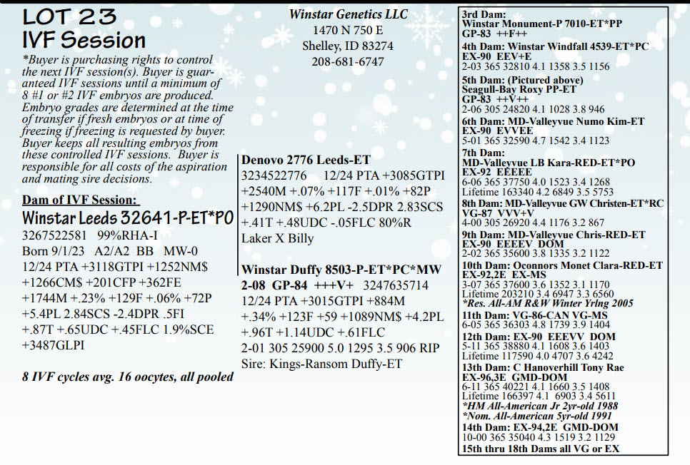 *Buyer is purchasing rights to control the next IVF session(s). Buyer is guar- anteed IVF sessions until a minimum of 8 #1 or #2 IVF embryos are produced. Embryo grades are determined at the time of transfer if fresh embryos or at time of freezing if freezing is requested by buyer. Buyer keeps all resulting embryos from these controlled IVF sessions. Buyer is responsible for all costs of the aspiration and mating sire decisions. Dam of IVF Session: